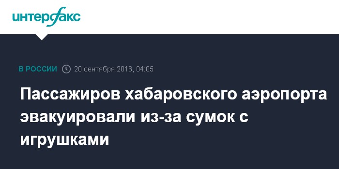 Москва. 20 сентября. INTERFAX.RU - Работа хабаровского аэропорта была приостановлена на полтора часа из-за двух бесхозных сумок, в которых оказались детские игрушки.
