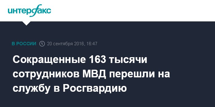 Москва. 20 сентября. INTERFAX.RU - Численность МВД РФ уменьшится на 163 тысяч сотрудников за счет их перехода на службу в Росгвардию в соответствии с указом президента РФ, разъяснили "Интерфаксу" во вторник в пресс-центре МВД.