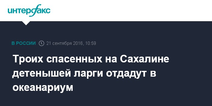 Москва. 21 сентября. INTERFAX.RU - Три ларги, спасенные активистами фонда защиты природы "Зеленый Сахалин", которые неадаптивны для выпуска в море, в ближайшее время отправятся в океанариум одного из регионов РФ.