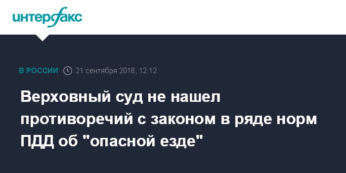 Москва. 21 сентября. INTERFAX.RU - Верховный суд РФ признал соответствующими российскому законодательству ряда норм понятия "опасное вождение", введённого в ПДД.