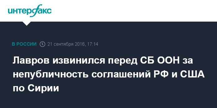 Москва. 21 сентября. INTERFAX.RU - Глава МИД РФ Сергей Лавров принес извинения, выступая на министерском заседании Совета безопасности ООН, за то, что договоренности РФ и США от 9 сентября остаются непубличными.