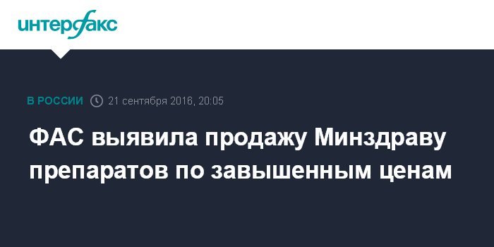 Москва. 21 сентября. INTERFAX.RU - Федеральная антимонопольная служба установила случаи завышения цен на ряд лекарственных препаратов, централизованно закупаемых Минздравом по программе "7 нозологий".