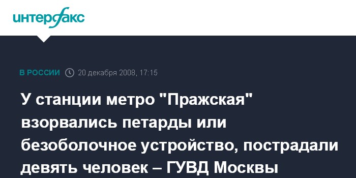 Москва. 20 декабря. INTERFAX.RU - В ГУВД Москвы подтвердили информацию о том, что в субботу днем в районе станции метро "Пражская" произошел взрыв, в результате которого пострадали девять человек.