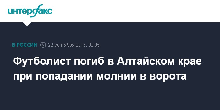 Москва. 22 сентября. INTERFAX.RU - Из-за удара молнии в ворота на футбольном поле погиб 18-летний игрок, сообщило СУ СКР по Алтайскому краю.
