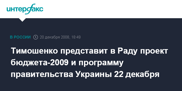Премьер-министр Юлия Тимошенко сообщила, что в понедельник, 22 декабря, программа будет передана на утверждение Верховной Рады вместе с проектом бюджета на 2009 год.