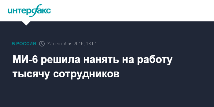 Москва. 22 сентября. INTERFAX.RU - Британская служба внешней разведки МИ-6 решила нанять дополнительно тысячу новых сотрудников для противодействия современным угрозам, сообщает Sky News.