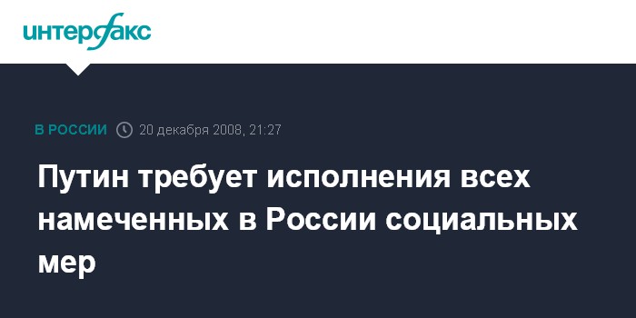 Москва. 20 декабря. ИНТЕРФАКС - Премьер-министр РФ Владимир Путин потребовал, чтобы все намеченные меры в области здравоохранения, образования и жилищного строительства были исполнены, несмотря на мировой финансово-экономический кризис.