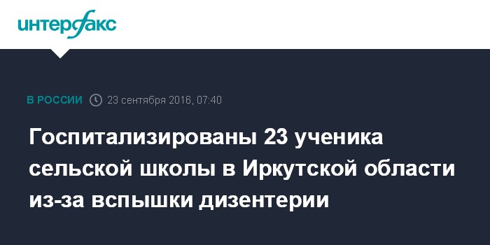 Москва. 23 сентября. INTERFAX.RU - Врачи госпитализировали 25 человек после вспышки дизентерии в Улейской средней школе в Осинском районе Иркутской области, сообщили агентству "Интерфакс" в пятницу в региональном министерстве здравоохранения.