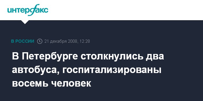 "В 10:45 мск на Красносельском шоссе произошло столкновение двух автобусов, один из которых следовал без пассажиров. В результате аварии травмы различных степеней тяжести получили восемь человек, они госпитализированы", - сказал собеседник агентства.