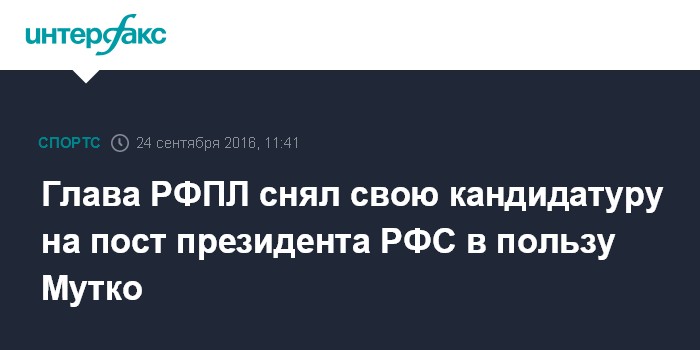 Москва. 24 сентября. INTERFAX.RU - Глава Российской футбольной Премьер-лиги Сергей Прядкин, являвшийся одним из кандидатов на пост президента Российского футбольного союза (РФС), отказался от участия в выборах в пользу другого кандидата - министра спорта Виталия Мутко.