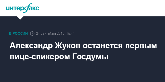 "Первым вице-спикером останется Александр Дмитриевич Жуков от "Единой России". Такой вариант рассматривался при обсуждении выдвигаемой конструкции", - сказал собеседник агентства в субботу.