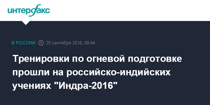 Москва. 25 сентября. INTERFAX.RU - В рамках проведения совместного российско-индийского учения "Индра-2016" на Сергеевском полигоне прошли показные занятия по огневой подготовке, сообщает в воскресенье начальник отдела информационного обеспечения пресс-службы Восточного военного округа (ВВО) капитан 2 ранга Владимир Матвеев.