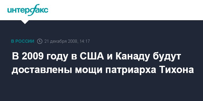 Москва. 21 декабря. INTERFAX.RU - Мощи святителя Тихона, патриарха Московского и всея Руси, будут в 2009 году принесены в приходы Русской зарубежной церкви в США и Канаде, сообщили в Фонде Андрея Первозванного.