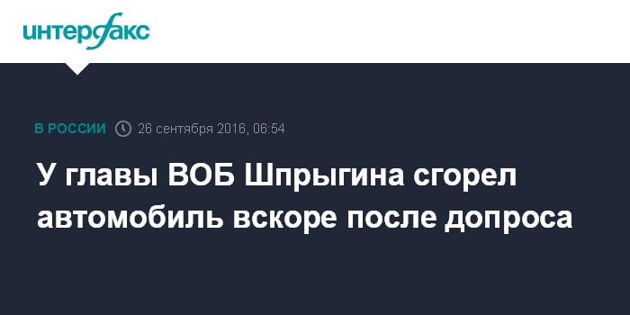 Москва. 26 сентября. INTERFAX.RU - Глава Всероссийского объединения болельщиков Александр Шпрыгин сообщил, что его автомобиль сожгли. Он уточнил, что работающие не месте эксперты предполагают поджог.
