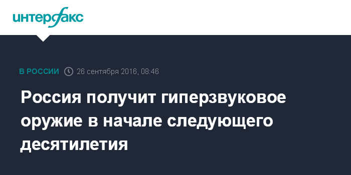 Москва. 26 сентября. INTERFAX.RU - Россия может получить гиперзвуковое оружие в начале следующего десятилетия, сказал глава корпорации "Тактическое ракетное вооружение" (КТРВ) Борис Обносов в интервью газете "Коммерсант".