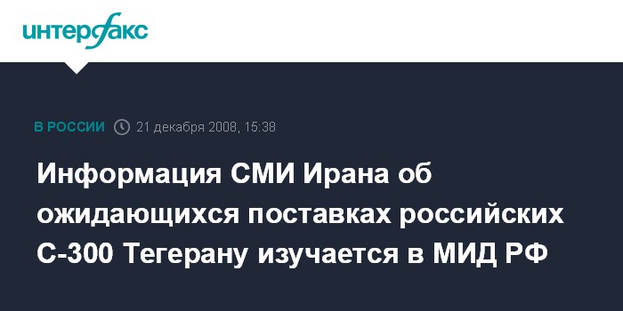 Москва. 21 декабря. INTERFAX.RU - В МИД РФ изучают появившуюся в иранских СМИ информацию о том, что Россия поставит Ирану комплектующие к зенитно-ракетным комплексам С-300.