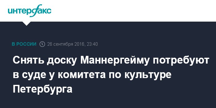 Москва. 26 сентября. INTERFAX.RU - Смольнинский районный суд Санкт-Петербурга во вторник продолжит рассмотрение иска петербуржца Павла Кузнецова к городским властям о снятии доски Карлу Маннергейму. На прошлом заседании по данному делу 14 сентября судья Татьяна Матусяк попросила истца уточнить свои требования. По мнению суда, их нужно было адресовать комитету по культуре, который был привлечён к процессу как третье лицо, а не к правительству Петербурга, которое изначально было заявлено в качестве ответчика.