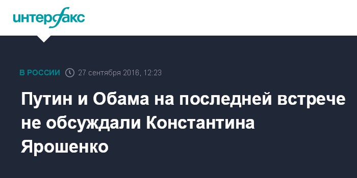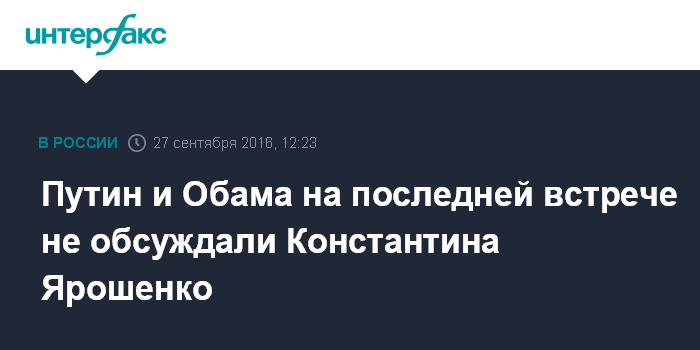 Москва. 27 сентября. INTERFAX.RU - Судьба российского летчика Константина Ярошенко на последней встрече президентов России и США не обсуждалась, заявил пресс-секретарь президента РФ Дмитрий Песков.