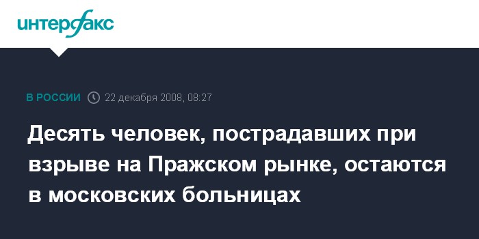 Москва. 22 декабря. INTERFAX.RU - В московских стационарах, по состоянию на утро понедельника, остаются 10 пострадавших в результате взрыва на Пражском рынке, произошедшем в минувшую субботу, сообщил "Интерфаксу" источник в медицинских кругах столицы.