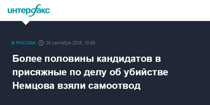 Москва. 28 сентября. INTERFAX.RU - Более 50 из 84 кандидатов в коллегию присяжных по уголовному делу в отношении пятерых обвиняемых в убийстве оппозиционного политика Бориса Немцова взяли самоотвод.