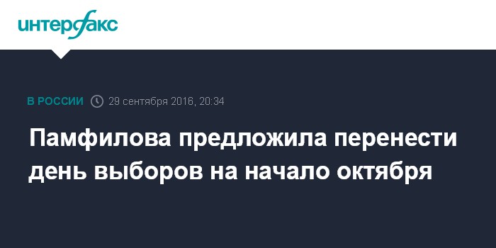 Москва. 29 сентября. INTERFAX.RU - Глава ЦИК РФ Элла Памфилова считает необходимым перенести единый день голосования на конец сентября - начало октября.