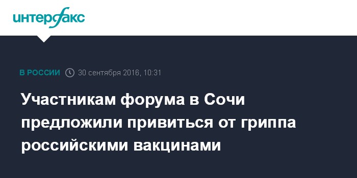Москва. 30 сентября. INTERFAX.RU - Участникам Международного инвестиционного форума в Сочи будут делать прививки от гриппа отечественными вакцинами, сообщает оргкомитет форума.