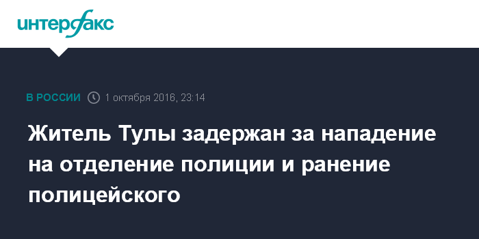 Москва. 1 октября. INTERFAX.RU - Полицейские в Туле задержали мужчину, напавшего с ножом на сотрудника дежурной части отделения полиции "Косогорское", находившегося при исполнении служебных обязанностей", сообщила "Интерфаксу" в субботу официальный представитель МВД России Ирина Волк.