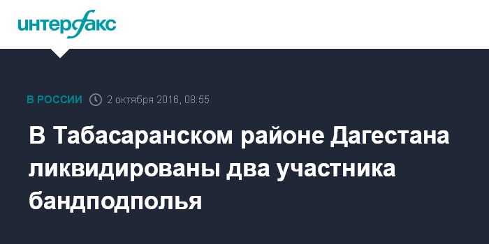 Москва. 2 октября. INTERFAX.RU - Двое боевиков уничтожены на окраине селения Акка в Табасаранском районе Дагестана в ходе КТО, сообщили агентству "Интерфакс" в силовых структурах республики.