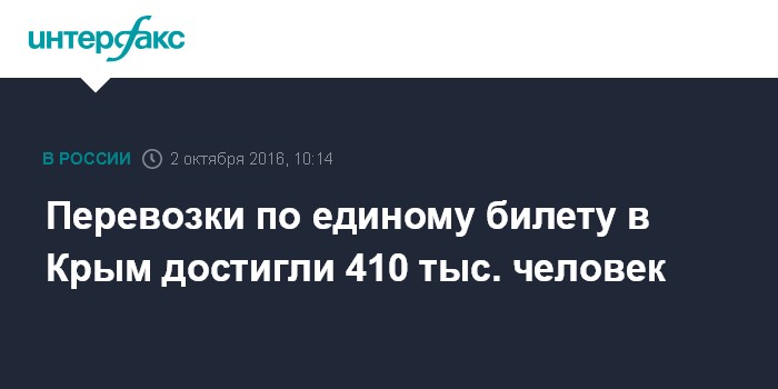 Москва. 2 октября. INTERFAX.RU - Перевозки по единому билету с использованием железнодорожного, автобусного и морского транспорта с материковой России в Крым и обратно в сезоне-2016 (с 30 апреля по 30 сентября) выросли по сравнению с минувшим сезоном на 14,5% - до 410 тысяч человек, сообщил пресс-центр "Российских железных дорог".