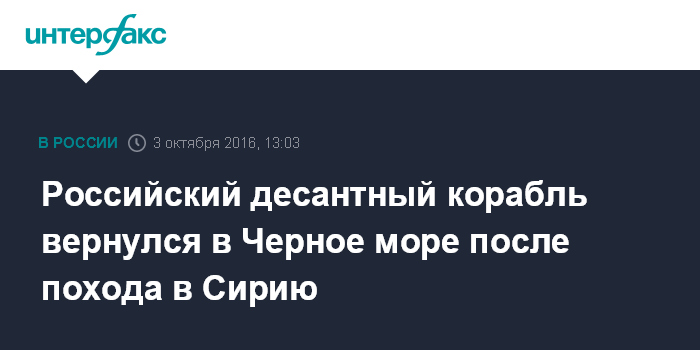 Москва. 3 октября. INTERFAX.RU - Большой десантный корабль Северного флота "Георгий Победоносец" в понедельник утром, пройдя Босфор, вернулся в акваторию Черного моря после 10-дневного похода в Сирию, сообщили местные ресурсы, публикующие фотографии его прохождения через пролив.