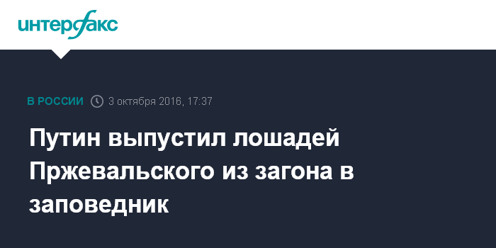 Москва. 3 октября. INTERFAX.RU - Президент РФ Владимир Путин посетил государственный природный заповедник "Оренбургский", в котором воссоздают популяцию лошади Пржевальского.