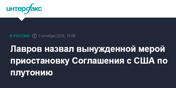 Москва. 3 октября. INTERFAX.RU - Глава МИД РФ Сергей Лавров назвал вынужденным решение России о приостановке действия Соглашения с США об утилизации плутония от 2000 года.