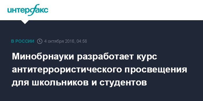 "Образовательное ведомство планирует до конца года разработать и разослать не менее чем в 50 регионов учебно-методические материалы для организации антитеррористического и антиэкстремистского просвещения учащихся общеобразовательных и профессиональных учебных заведений", - сообщает издание.