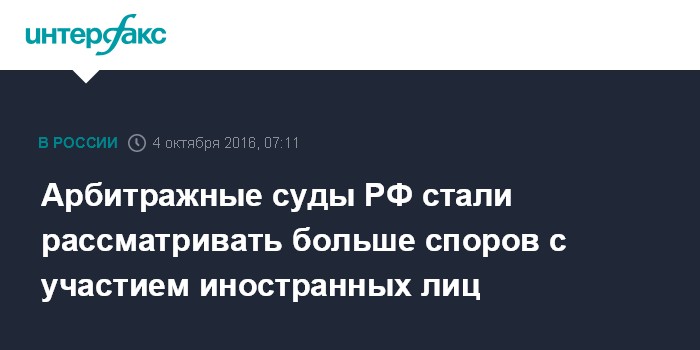 Москва. 4 октября. INTERFAX.RU - Председатель Верховного суда РФ Вячеслав Лебедев отмечает увеличение количества рассмотренных арбитражными судами РФ споров с участием иностранных лиц.