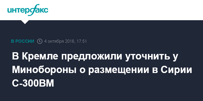 Москва. 4 октября. INTERFAX.RU - Пресс-секретарь президента Дмитрий Песков не стал комментировать сообщения о том, что Россия впервые развернула в Сирии системы С-300ВМ, заявив вместе с тем, что ранее в Сирии действительно размещались различные средства ПВО.