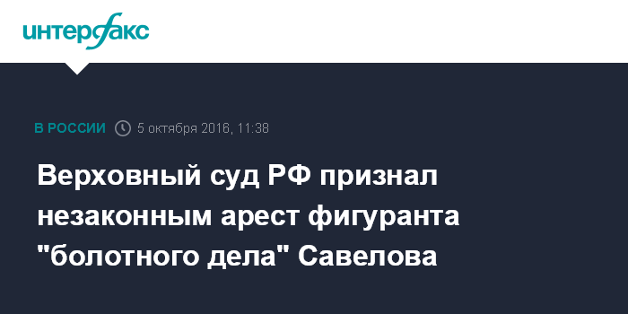 Москва. 5 октября. INTERFAX.RU - Президиум Верховного суда РФ согласился с решением Европейского суда по правам человека (ЕСПЧ) и признал незаконным решение об аресте и дальнейшем содержании под стражей фигуранта "болотного дела" Артёма Савелова.