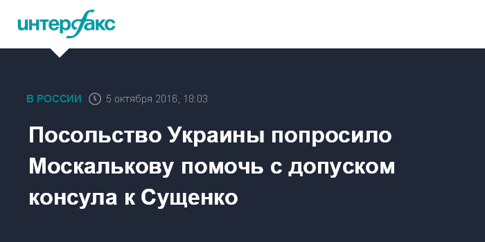 Москва. 5 октября. INTERFAX.RU - Посольство Украины в России направило в адрес уполномоченного по правам человека в РФ Татьяне Москальковой письмо с просьбой о содействии в допуске к задержанному и арестованному в России украинскому журналисту Роману Сущенко украинских консулов.