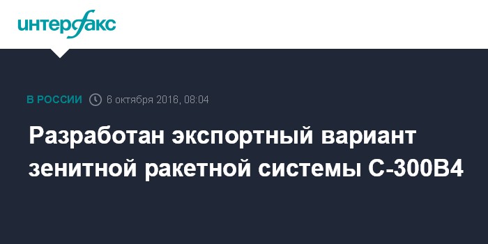 Москва. 6 октября. INTERFAX.RU - Концерн ВКО "Алмаз-Антей" завершил работы по подготовке экспортного варианта зенитной ракетной системы нового поколения С-300В4, - сообщил "Интерфаксу" в четверг высокопоставленный источник в оборонно-промышленном комплексе.