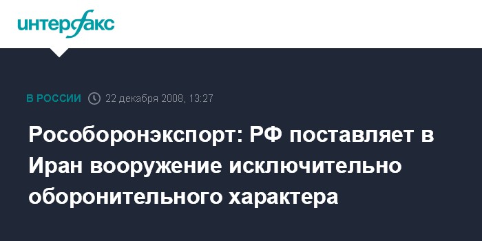 Москва. 22 декабря. INTERFAX.RU - В Рособоронэкспорте заявляют, что в Иран из России поставляются "исключительно системы оборонительного характера, к которым относятся и средства ПВО".