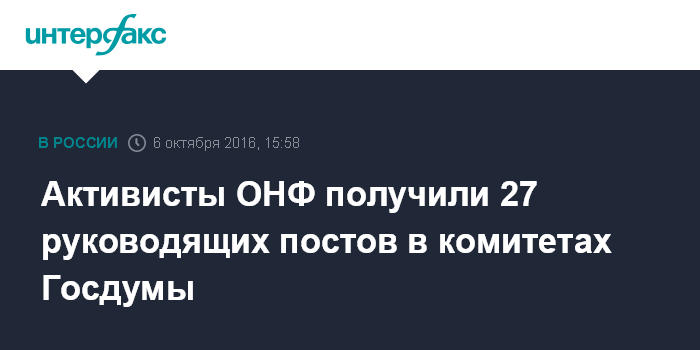 "Активисты ОНФ, избранные депутатами, возглавили семь комитетов Госдумы. Всего руководящие должности в комитетах Госдумы заняли 27 представителей Народного фронта", - говорится в пресс-релизе организации, поступившем в "Интерфакс" в четверг.