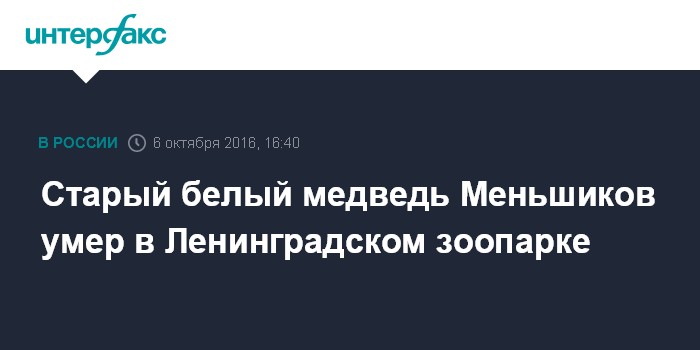 Москва. 6 октября. INTERFAX.RU - Белый медведь по прозвищу Меньшиков, привезенный в Ленинградский зоопарк из дикой природы в 1989 году, скончался 4 октября в возрасте 27 лет, сообщила в четверг пресс-служба зверинца.