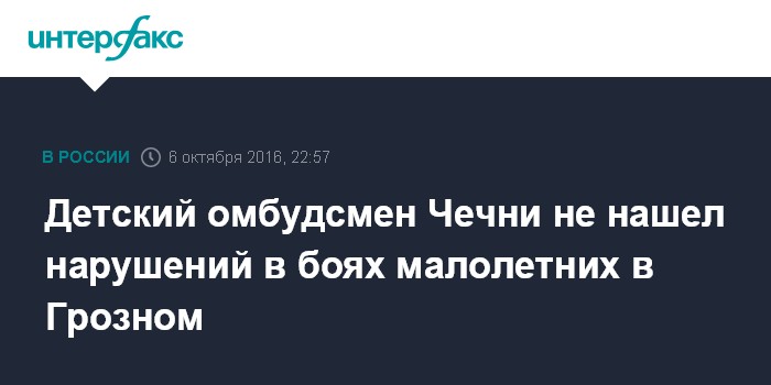 Москва. 6 октября. INTERFAX.RU - Детский омбудсмен в Чечне Хамзат Хирахматов заявил об отсутствии нарушений прав ребенка в ходе проведения детских рукопашных боев в республике.