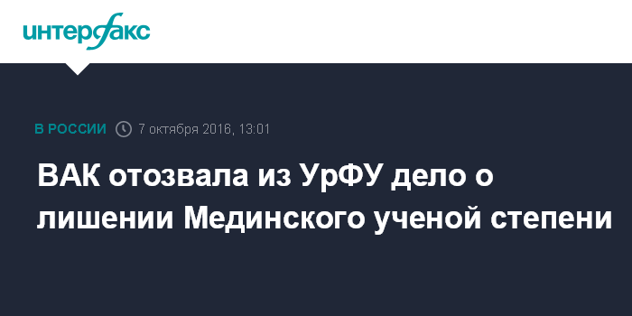 ВАК отозвала из УрФУ дело о лишении Мединского ученой степени