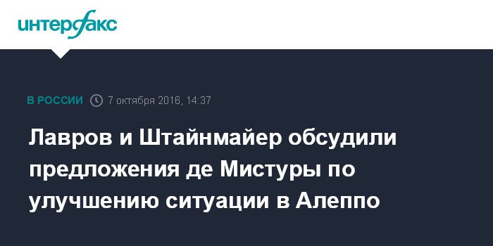 "Выражена готовность сторон рассмотреть предложения спецпредставителя Генсекретаря ООН по Сирии де Мистуры по облегчению ситуации в Алеппо с опорой на имеющиеся резолюции СБ ООН и решения Международной группы поддержки Сирии", - заявляет МИД РФ.