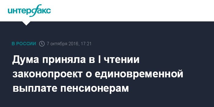 Москва. 7 октября. INTERFAX.RU - Госдума на заседании в пятницу приняла в первом чтении правительственный законопроект о единовременной выплате пенсионерам.