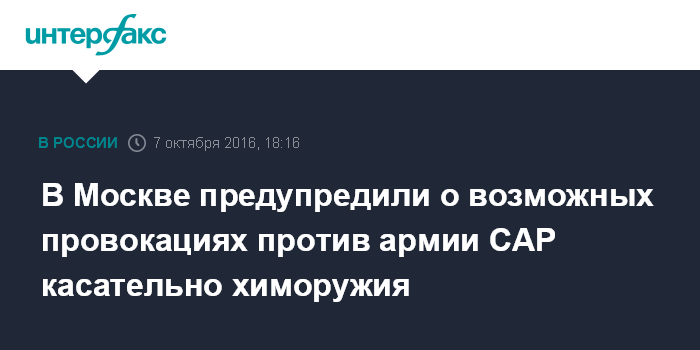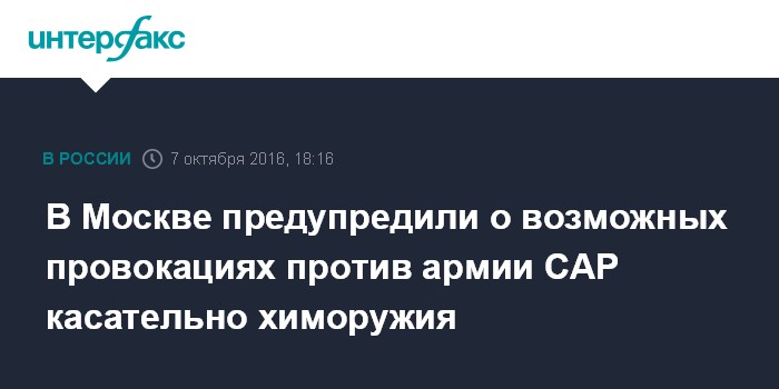 Москва. 7 октября. INTERFAX.RU - Москва предупреждает, что в ближайшее время может быть устроена провокация с обвинением сирийской армии в применении химического оружия.