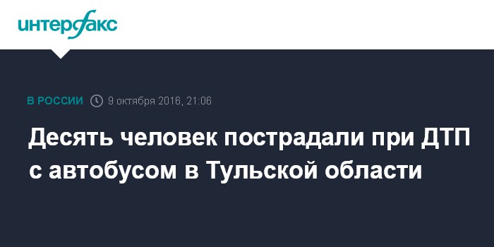 Москва. 9 октября. INTERFAX.RU - 10 человек пострадали в результате ДТП с участием пассажирского автобуса "Владикавказ-Москва" в Узловском районе Тульской области, сообщил "Интерфаксу" источник в правоохранительных органах региона.