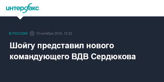 Москва. 10 октября. INTERFAX.RU - Министр обороны Сергей Шойгу вручил штандарт новому командующему ВДВ генерал-полковнику Андрею Сердюкову и представил его личному составу.