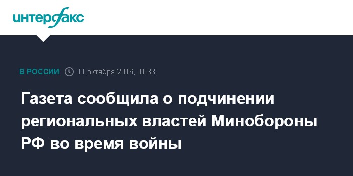Москва. 11 октября. INTERFAX.RU - Губернаторы, органы местного самоуправления краев, областей, автономных республик и городов федерального значения, региональные управления МВД, МЧС, ФСБ, а также части и подразделения Росгвардии в военное время перейдут в подчинение командованиям военных округов Минобороны России, сообщает во вторник газета "Известия" со ссылкой на высокопоставленный источник в военном ведомстве.