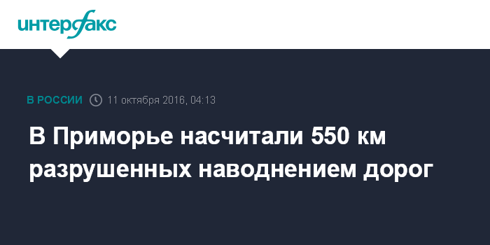Москва. 11 октября. INTERFAX.RU - Осмотр пострадавших в результате наводнения в Приморье дорог и мостов завершен, ремонт требуют почти 550 км дорог.